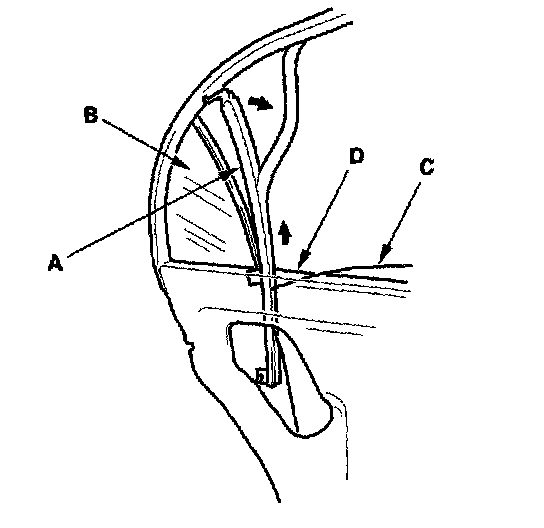 5. Move the center channel (A) away from the quarter glass (B), and the rear door glass (C), and remove the center channel out through the window slot. Take care not to damage the outer weatherstrip (D).