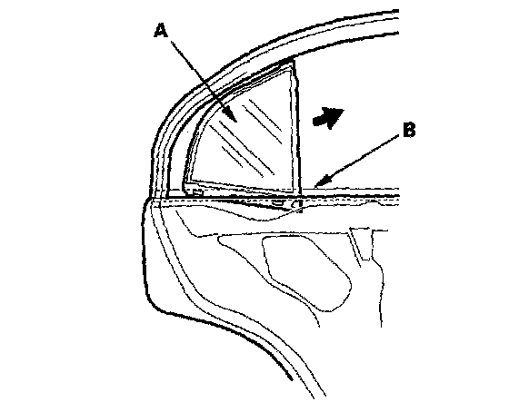 6. Remove the quarter glass (A). Take care not to damage the outer weatherstrip (B).