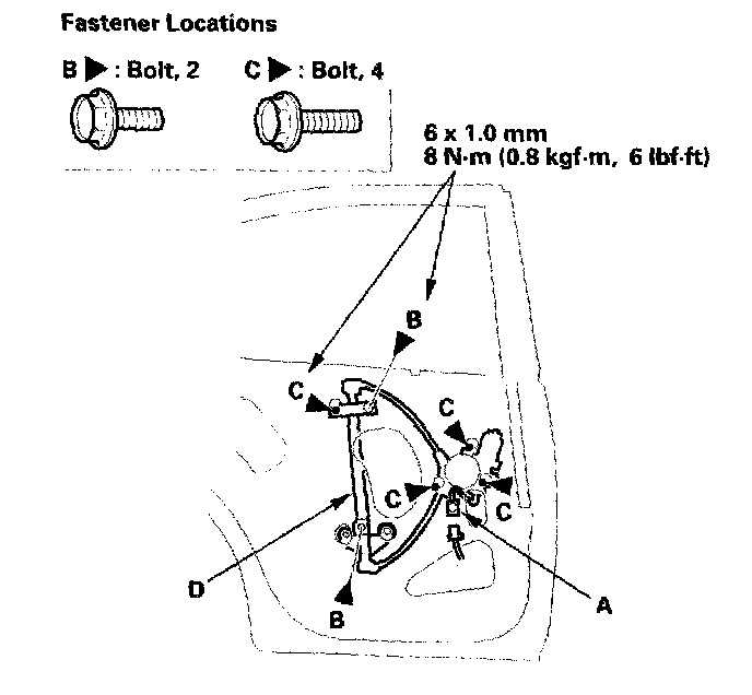 9. Remove the bolts (B), and loosen the bolts (C), then remove the regulator (D) through the hole in the door.
