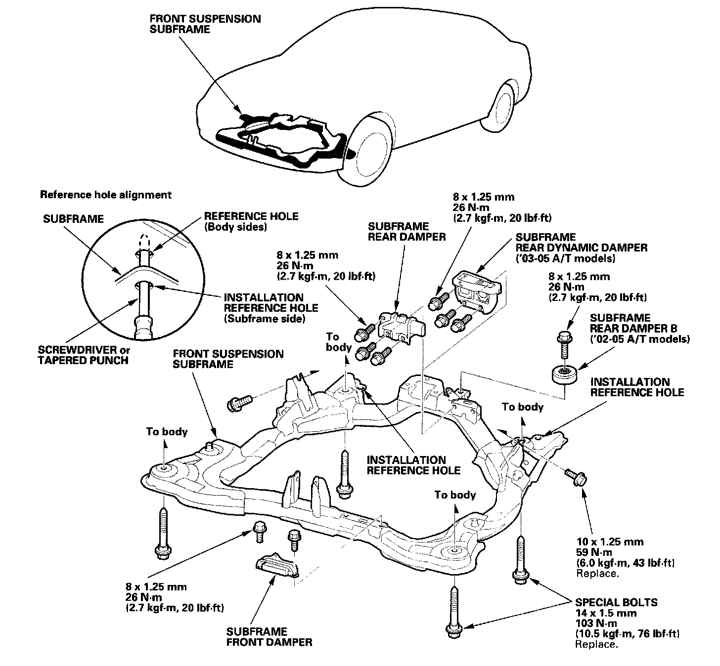 After loosening the subframe mounting bolts, be sure to replace them with new ones