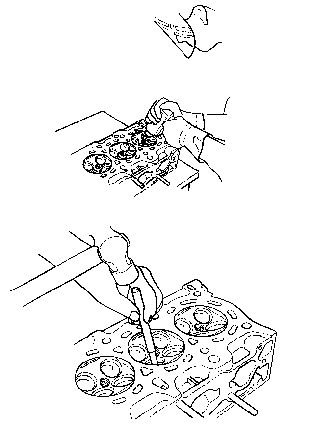 4. Working from the camshaft side, use the driver and an air hammer to drive the guide about 2 mm (0.1 inch) towards the combustion chamber. This will knock off some of the carbon and make removal easier. Hold the air hammer directly in line with the valve guide to prevent damaging the driver.