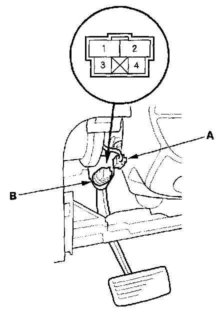 Brake Pedal Position Switch Test1. Disconnect the 4P connector (A) from the brake pedal position switch (B).