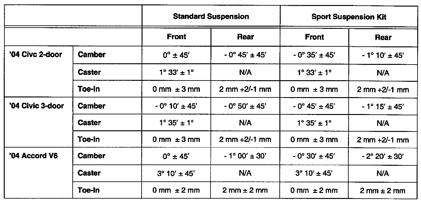 Doing an alignment on a 2004 Accord V6 or a 2004 Civic 2-door or 3-door equipped with the Sport Suspension Kit? Keep in mind the alignment specs aren't entirely the same as the standard specs in the S/M. Refer to this chart for the proper specs on these vehicles.