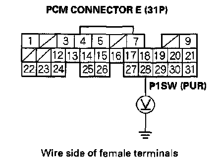 6. Measure voltage between PCM connector terminal E28 and body ground.