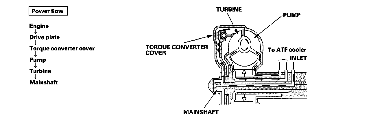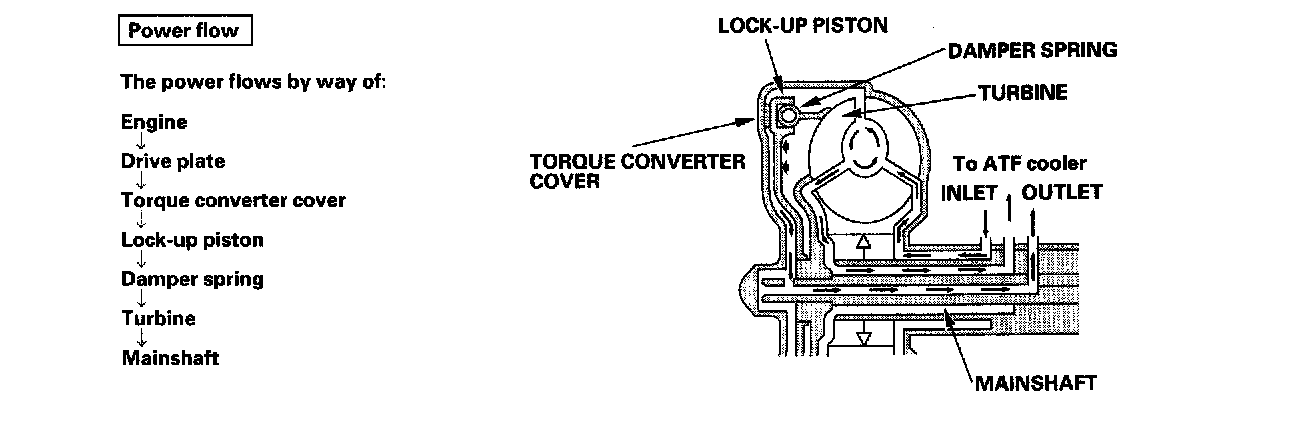 Fluid in the camber between the torque converter cover and the lock-up clutch piston is drained off, and fluid entered from the chamber between the pump and stator exerts pressure through the lock-up clutch piston against the torque converter cover. The lock-up clutch piston engages with the torque converter cover (lock-up clutch ON), and the mainshaft rotates at the same speed as the engine.