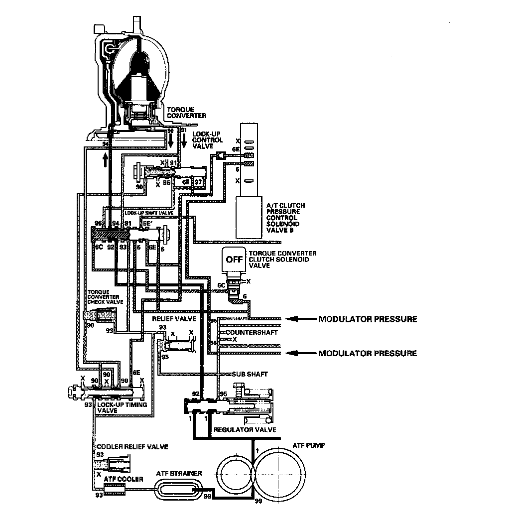 The torque converter clutch solenoid valve is turned OFF by the PCM. The lock-up shift valve receives modulator (LCA) pressure (6C) on the left side, and stays in the right side to uncover the port leading torque converter pressure (94) to the left side of the torque converter. Torque converter pressure (94) enters into the left side of the torque converter to disengage the lock-up clutch. The lock-up clutch piston keeps away from the torque converter cover; the lock-up clutch is OFF.