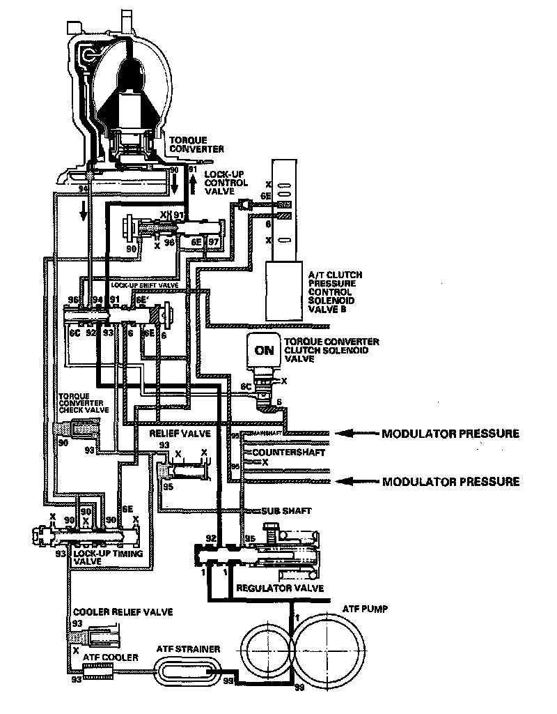 As the speed of the vehicle reaches the prescribed value, the torque converter clutch solenoid valve is turned ON by the PCM. Modulator (LCA) pressure (6C) in the left side of the lock-up shift valve is released, and the lock-up shift valve is moved to the left side to switch the port leading torque converter pressure (91) to the right side of the torque converter. Torque converter pressure (91) flows to the right side of the torque converter to engage the lock-up clutch. The PCM also controls the A/T clutch pressure control solenoid valve B. and linear sol B pressure (BE) is applied to the lock-up control valve and the lock-up timing valve. The positions of the lock-up control valve and lock-up timing valve depend on torque converter pressure and linear sol B pressure. When linear sol B pressure (BE) is low, torque converter pressure (91) from the lock-up shift valve to the right side of the torque converter is low, because torque converter pressure (91) leaks at the lock-up control valve. The lock-up clutch is engaged partially. Linear solenoid B pressure (BE) increases, the lock-up control valve is moved to the left side to cover the port draining torque converter pressure(91),and torque converter pressure (91) to torque converter is increased. The engagement of the lock-up clutch depends on torque converter pressure (91).