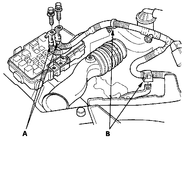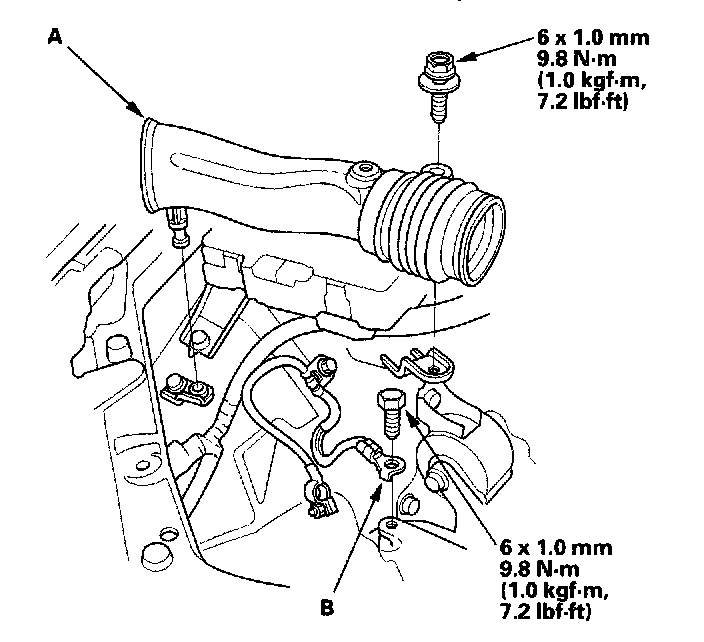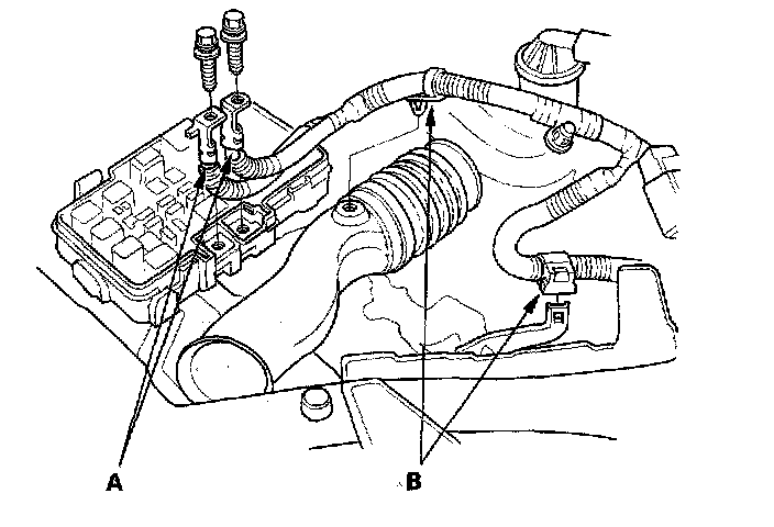 7. Remove the intake air duct (A) and ground cable (B).