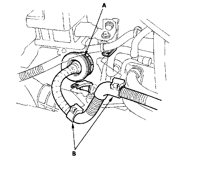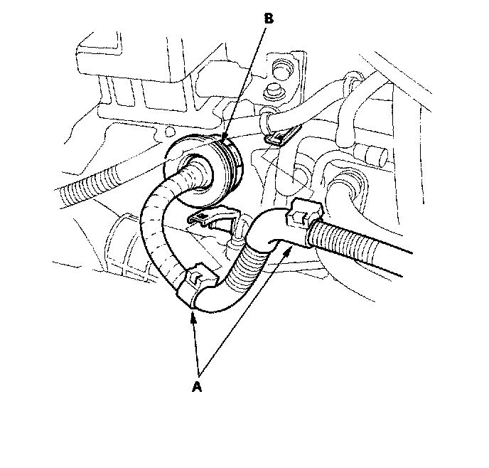 20. Remove the A/C hose bracket (A) and P/S hose bracket (B).