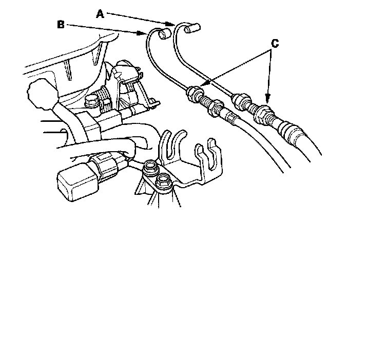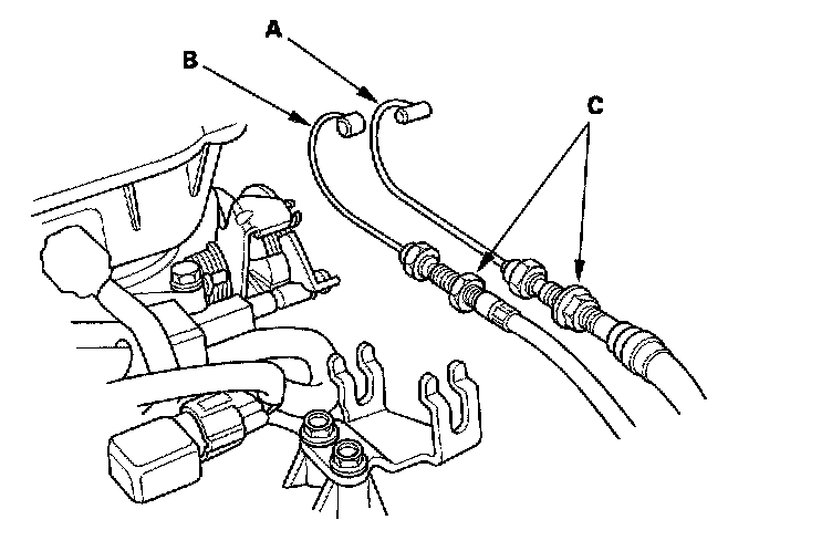 17. Remove the throttle cable (A) and cruise control cable (B) by loosening the locknuts (C), then slipping the cable ends out of the accelerator linkage. Take care not to bend the cables when removing them. Always replace any kinked cable with a new one.