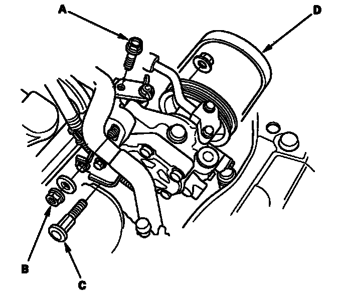 18. Remove the adjusting plate mounting bolt (A), locknut (B) and mounting bolt (C), then remove the power steering (P/S) pump belt (D) and pump without disconnecting the P/S hoses.