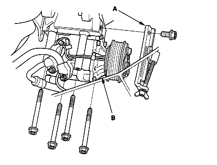 21. Remove the alternator lower bracket (A), then remove the A/C compressor (B) without disconnecting the A/C hoses.