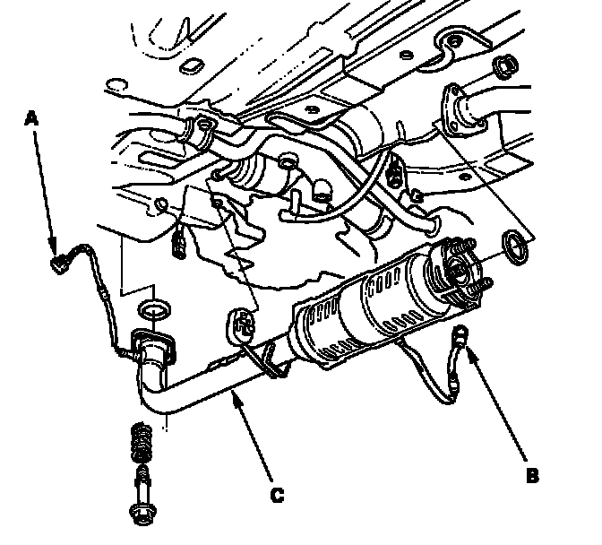 29. Disconnect the primary heated oxygen sensor (primary HO2S) connector (A) and secondary heated oxygen sensor (secondary HO2S) connector (B), then remove the exhaust pipe A/three way catalytic converter (TWC) (C) (D17A2 engine).
