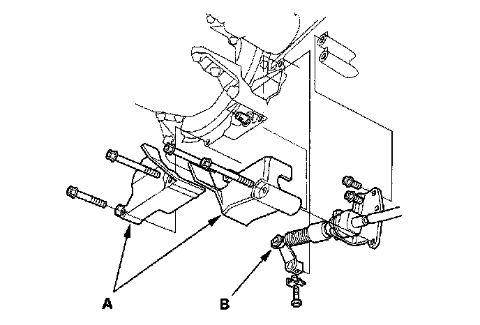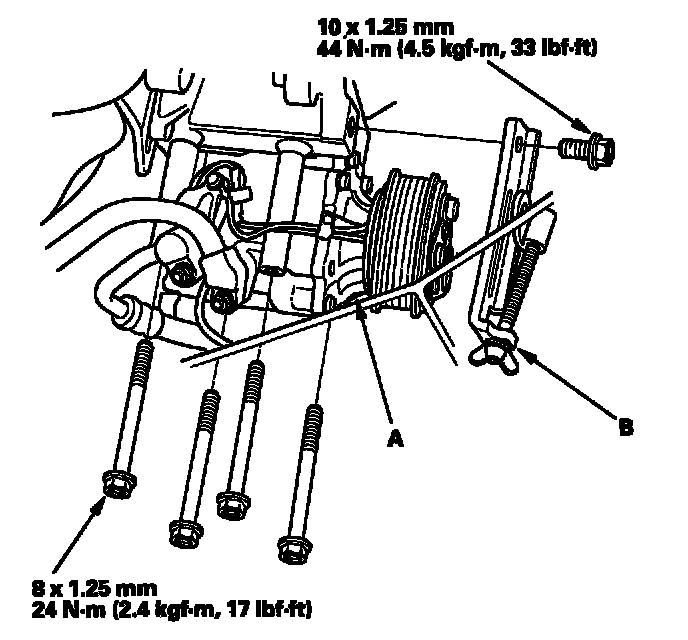 23. Install the A/C compressor (A), then install the alternator lower bracket (B).