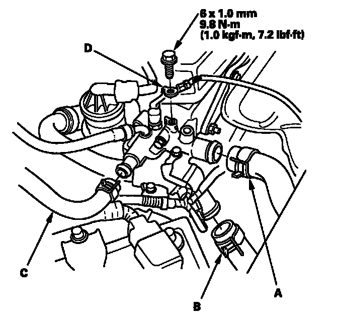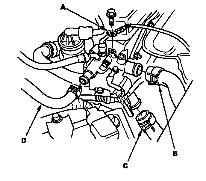 22. Install the upper radiator hose (A), lower radiator hose (B), heater hose (C) and ground cable (D).