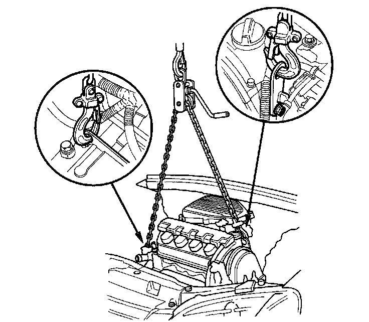 2. Position the engine under the vehicle. Attach the chain hoist to the engine, then lift the engine into position in the vehicle.