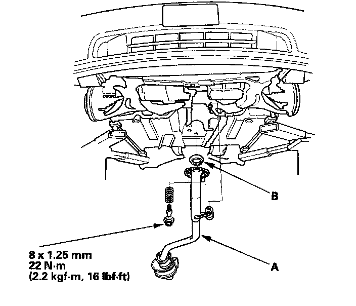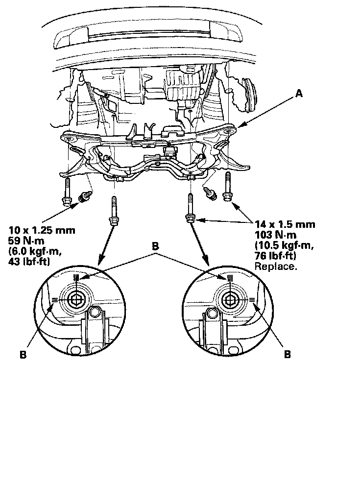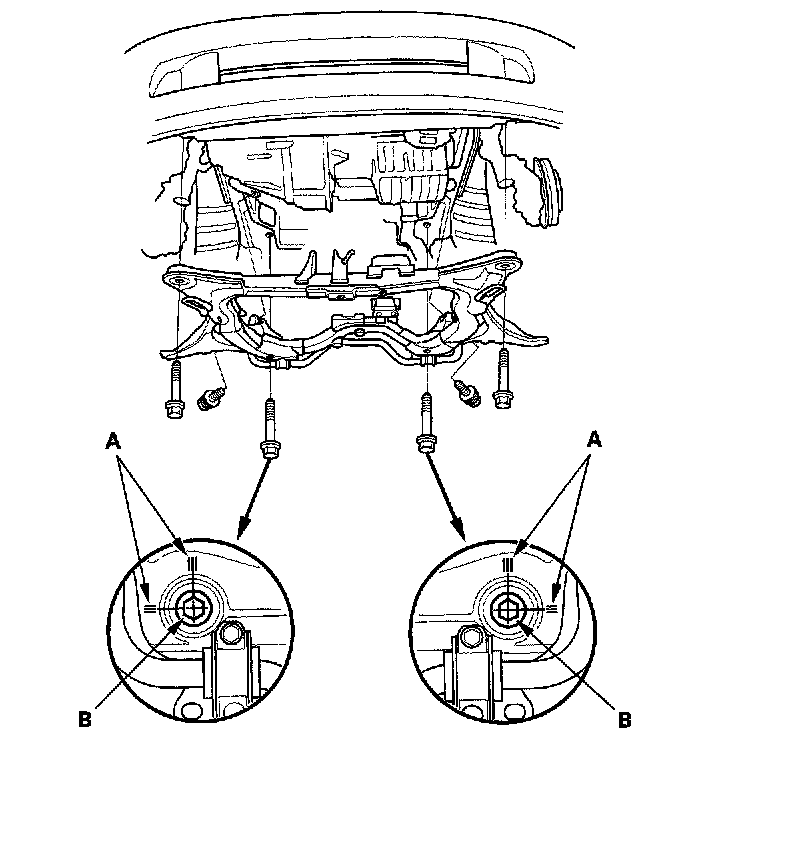 3. Install the subframe (A). Align the reference lines (B) on the subframe with the bolt head center, then tighten the bolts.