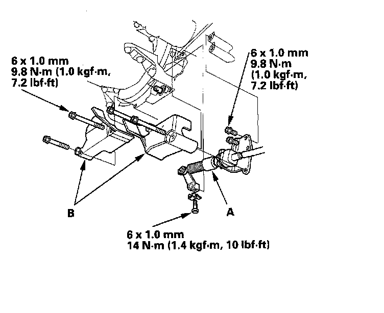 8. Remove the clutch slave cylinder (A) and clutch line bracket mounting bolt (B) (M/T).