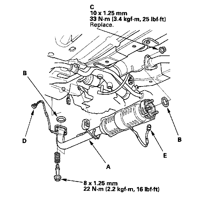 14. Install the exhaust pipe A/three way catalytic converter (TWC) assembly (A); use new gaskets (B) and new self locking nuts (C). Connect the primary heated oxygen sensor (primary H02S) connector (D) and secondary heated oxygen sensor (secondary H02S) connector (E) (D17A2 engine).