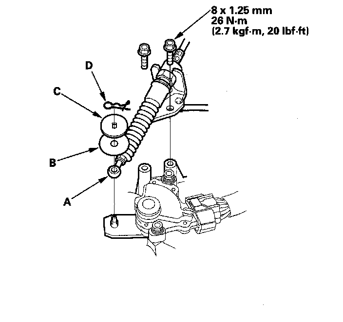 37. Install the shift cable (A) using the plastic washer (B), washer (C) and spring pin (D) (CVT).