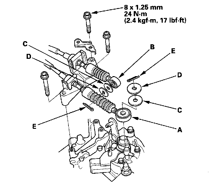38. Install the select cable (A) and shift cable (B) using the plastic washers (C), washers (D) and new cotter pins (E) (M/T).