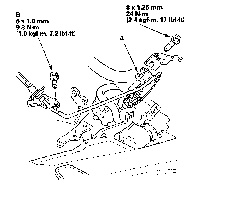 32. Remove the shift cable covers (A), then remove the shift control cable (B) (A/T).