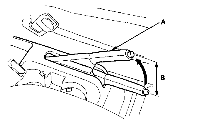 1. Pull the parking brake lever (A) with 196 N (20 kgf, 44 lbs.) of force to fully apply the parking brake. The parking brake lever should be locked within the specified number of clicks (B).