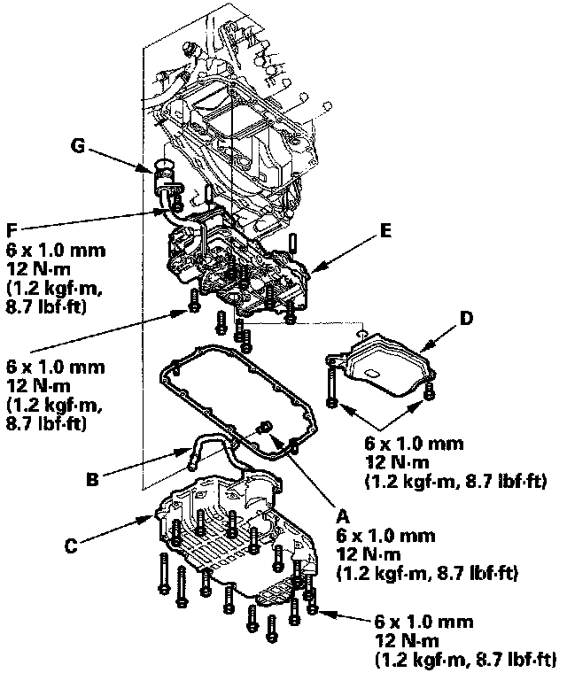 11. Remove the lower valve body assembly (E), and remove the bolt (F) securing the solenoid harness connector (G) with holding the lower valve body assembly, then remove the harness connector and valve body assembly.