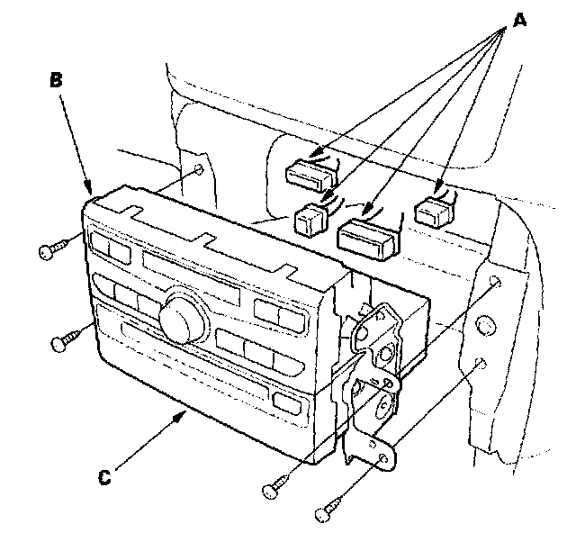 2. Disconnect the connectors (A) from the climate control unit (B) and DVD player unit (C).
