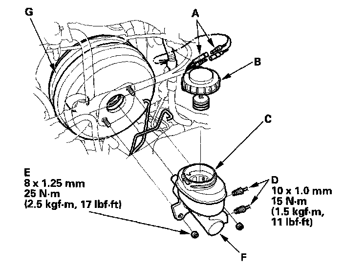 6. Remove the master cylinder (F) from the brake booster (G). Be careful not to bend or damage the brake lines when removing the master cylinder.