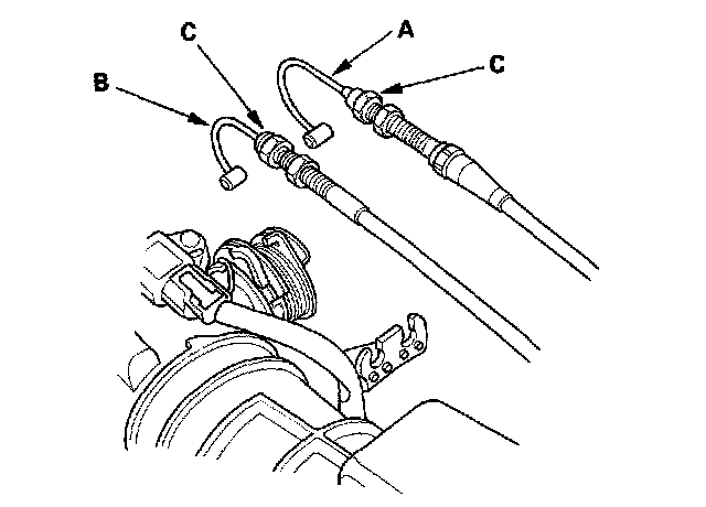 3. Remove the throttle cable (A) and cruise control cable (B) by loosening the locknuts (C), then slipping the cable ends out of the accelerator linkage. Take care not to bend the cables when removing them. Always replace any kinked cable with a new one.