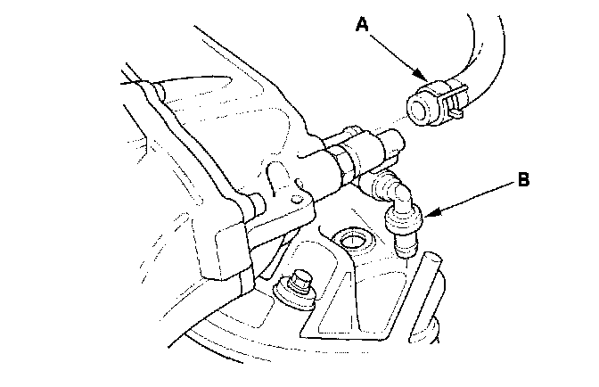 5. Remove the brake booster vacuum hose (A) and positive crankcase ventilation (PCV) hose (B).