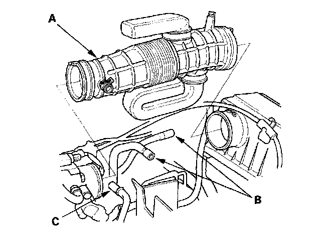 2. Remove the vacuum hoses (A) and breather pipe (B), then remove the intake air duct (C).