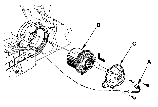 2. Disconnect the 2P connector (A) from the rear blower motor (B), then remove the self-tapping screw and the cover (C). Turn the rear blower motor clockwise to the stop, and remove it.