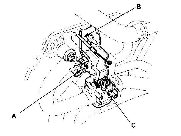 3. From under the hood, open the cable clamp (A), then disconnect the heater valve cable (B) from the heater valve arm (C). Turn the heater valve arm to the fully opened position as shown.