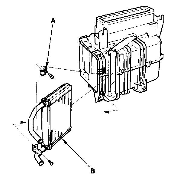 10. Remove the self-tapping screws and the clamp (A), then carefully pull out the heater core (B) so you don't bend the inlet and outlet pipes.