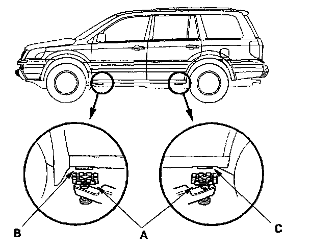 4. Position the floor jack under the front jacking bracket (A) or rear jacking bracket (B), center the jack lift platform (C), on the jacking bracket and jack up the vehicle high enough to fit the safety stands under it.