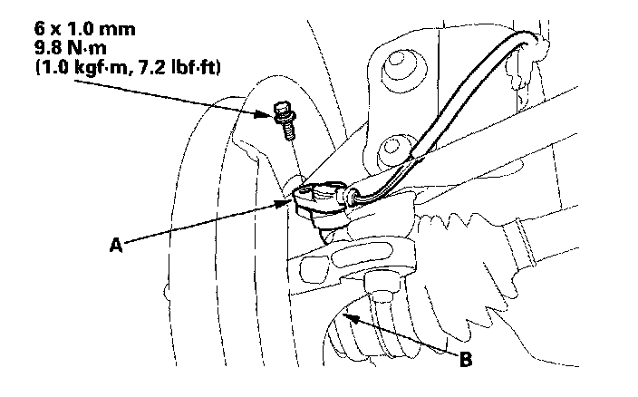 5. Remove the wheel sensor (A) from the knuckle (B). Do not disconnect the wheel sensor connector.
