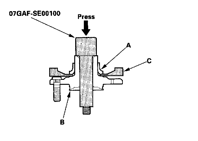 25. Install the hub (A) onto the knuckle (B) using the special tools and a press. Be careful not to deform the splash guard (C).