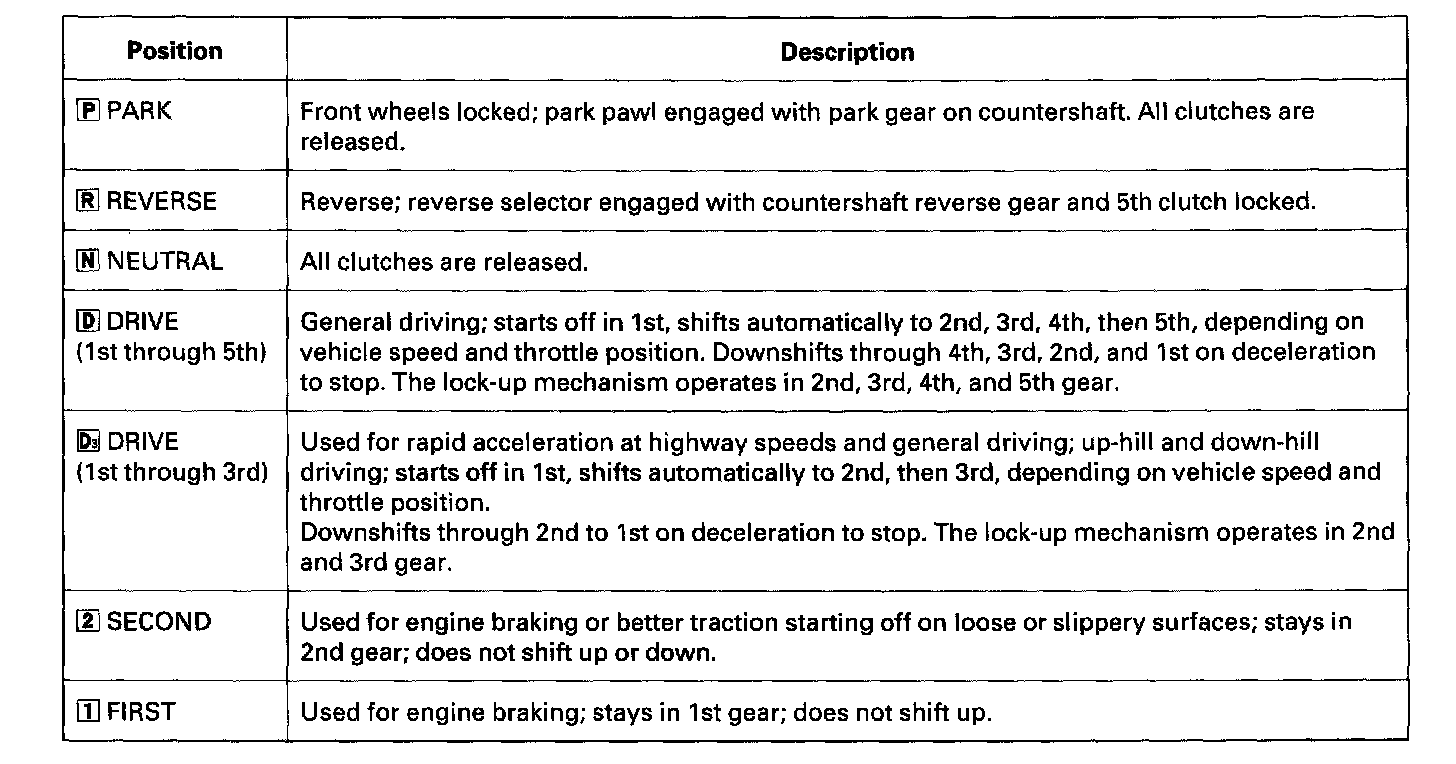 The shift lever has seven positions: [P] PARK, [R] REVERSE, [N] NEUTRAL, [D] 1st through 5th gear ranges, [D3] 1st through 3rd gear ranges, [2] 2nd gear, and [1] 1st gear.