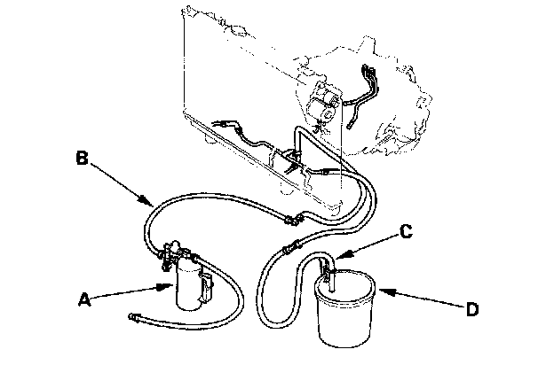 6. Connect the drain hose (C) to the inlet line on the ATF cooler using a clamp. Securely clamp the opposite end of the drain hose to a bucket (D) or floor drain.