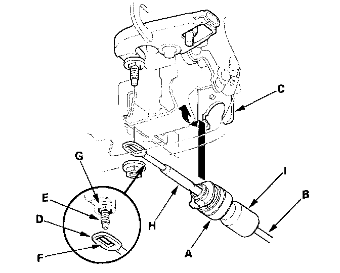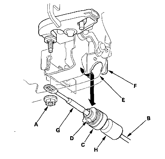 4. Rotate the socket holder (C) on the shift cable a quarter turn; the tab (D) on the socket holder will be in the opening (E) of the shift cable bracket (F). Then slide the holder to remove the shift cable from the shift cable bracket. Do not remove the shift cable by twisting the shift cable guide (G) and damper (H).