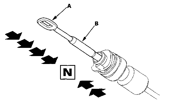 5. Push the shift cable (A) until it stops, then release it. Pull the shift cable back two steps so that the shift lever position is in [N]. Do not adjust the shift cable by holding the shift cable guide (B).