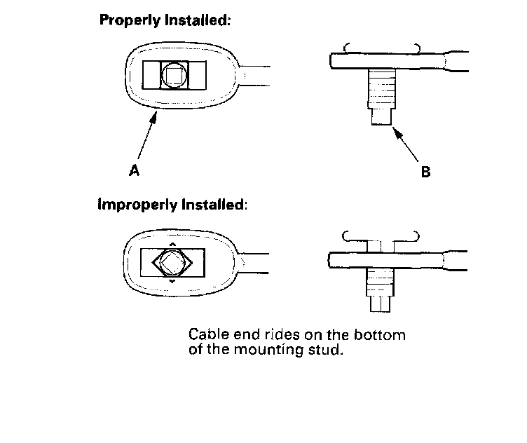 10. Verify that the shift cable end (A) is properly installed on the mounting stud (B).