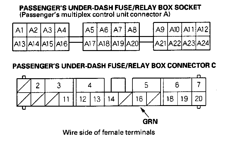 4. With the passenger's multiplex control unit still disconnected, make these input tests at the passenger's under-dash fuse/relay box socket.
