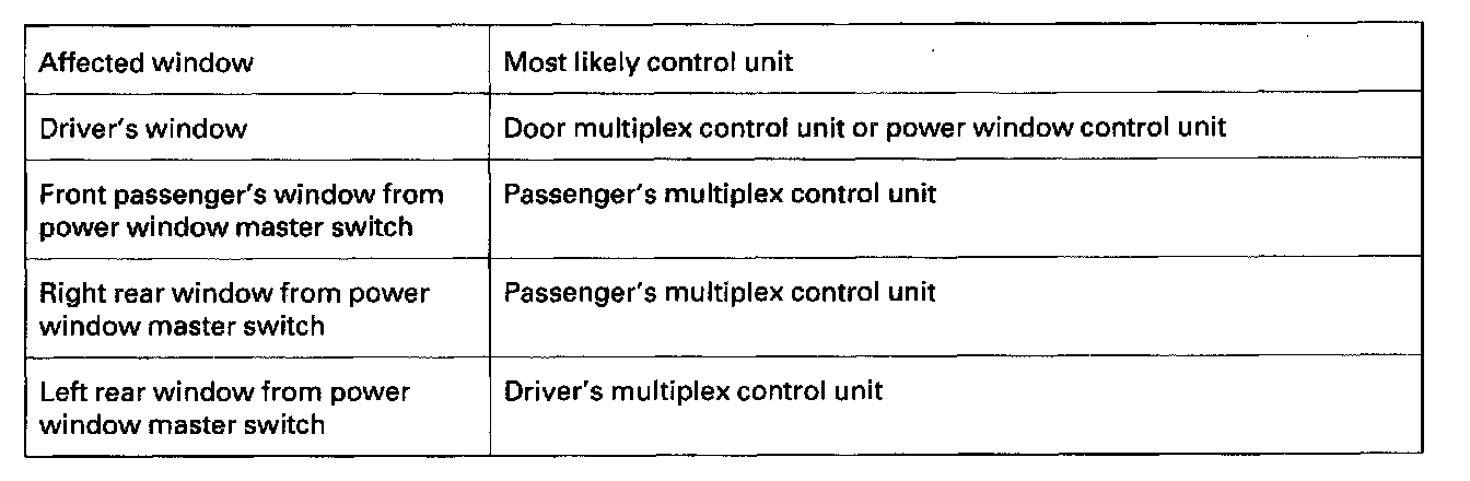 13. If all the input tests prove OK, one of the control units must be faulty. Substitute a known-good control unit for the one that is most likely at fault using the chart above, then check the system. If the system works properly, the original control unit is faulty; replace it. If there is still a malfunction, substitute a known-good control unit for the next most likely unit to be at fault, and recheck. If the system works properly, the original unit is faulty; replace it.