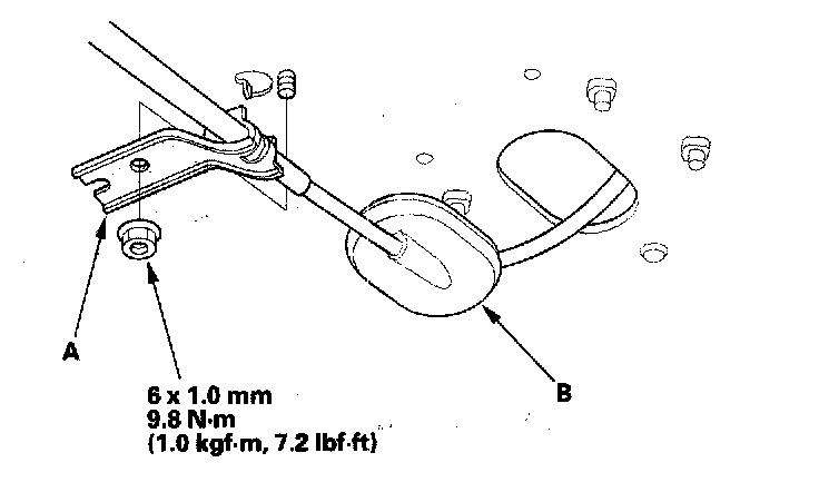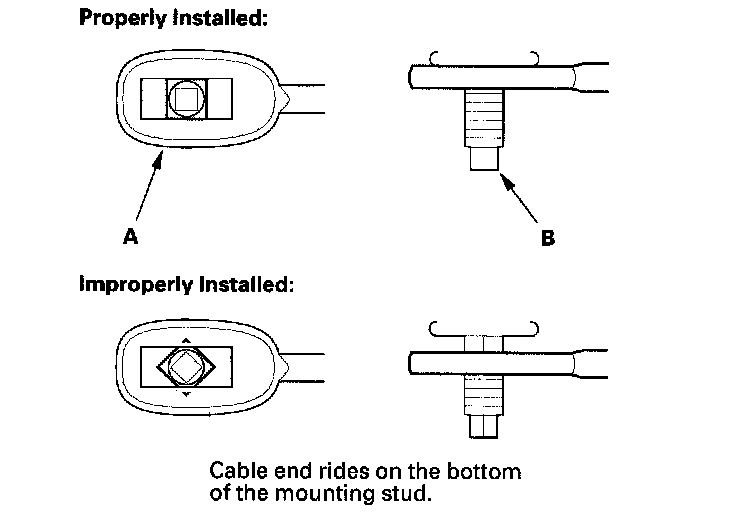 21. Verify that the shift cable end (A) is properly installed on the mounting stud (B).