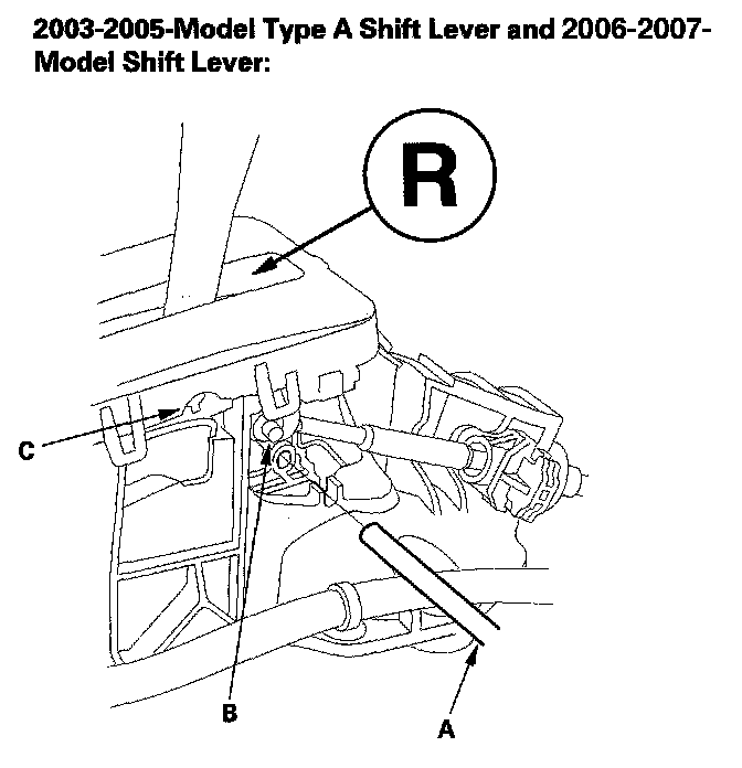 19. Insert a 6.0 mm (0.24 inch) pin (A) through the positioning hole (B) on the shift lever bracket base and into the positioning hole (C) on the shift lever. The shift lever is secured in the R position.