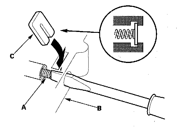 3. Install all the springs and seats. Insert the spring (A) in the valve, then install the valve in the valve body (B). Push the spring in with a screwdriver, then install the spring seat (C)
