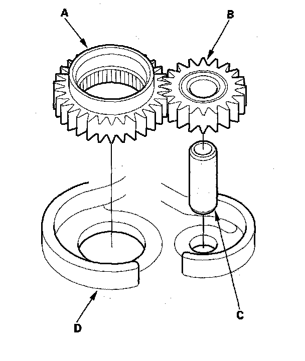 1. Install the ATF pump drive gear (A), driven gear (B), and ATF pump driven gear shaft (C) in the main valve body (D). Lubricate all parts with ATF, and install the ATF pump driven gear with its grooved and chamfered side facing up.